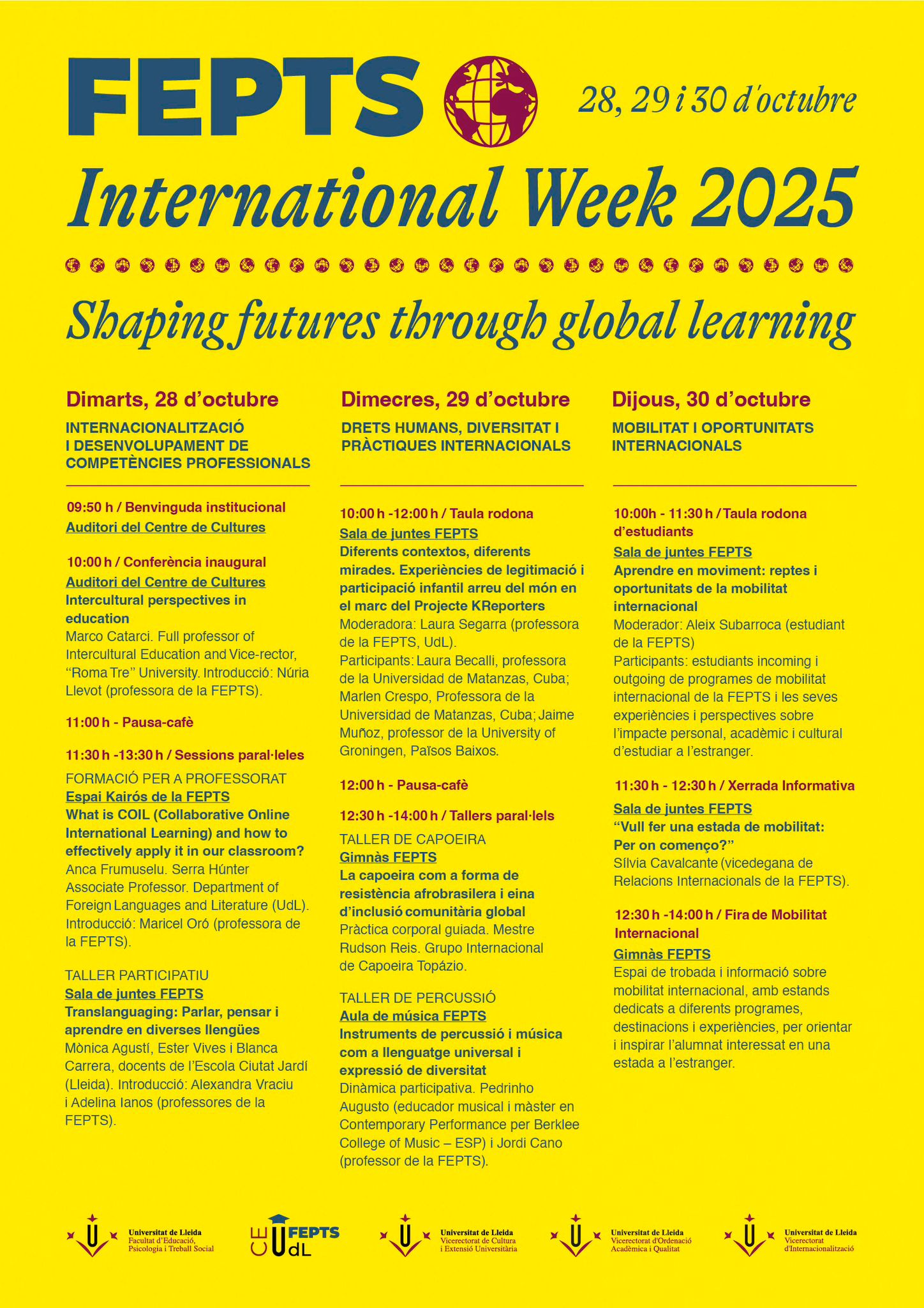 International Week FEPTS 2025, organised under the theme “Shaping the Future through Global Learning”, invited the academic community to reflect on the internationalisation of education and the development of skills for an interconnected world. From October 28 to 30, the Faculty of Education, Psychology, and Social Work hosted conferences, roundtables, workshops, and participatory activities involving students and faculty from diverse global contexts, fostering intercultural dialogue, collaboration, and a shared commitment to diversity, human rights, and educational transformation.